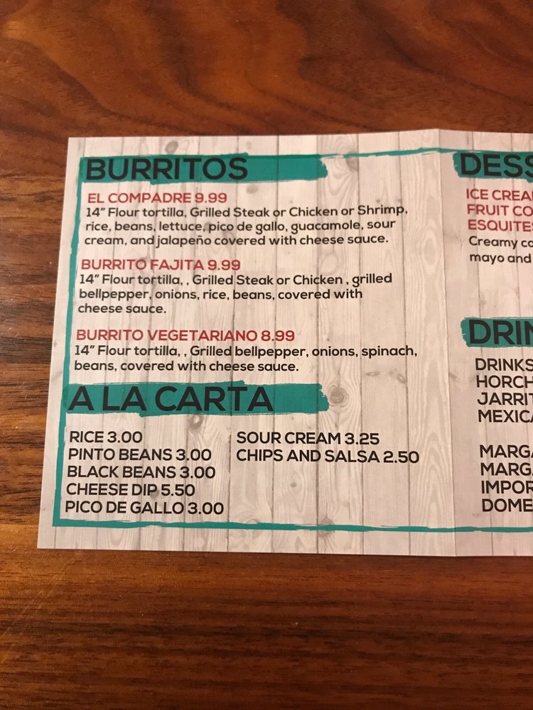 14" flour tortilla, grilled steak or chicken or shrimp, rice, beans, lettuce, pico de gallo, guacamole, sour cream, and jalapeno covered with cheese sauce.